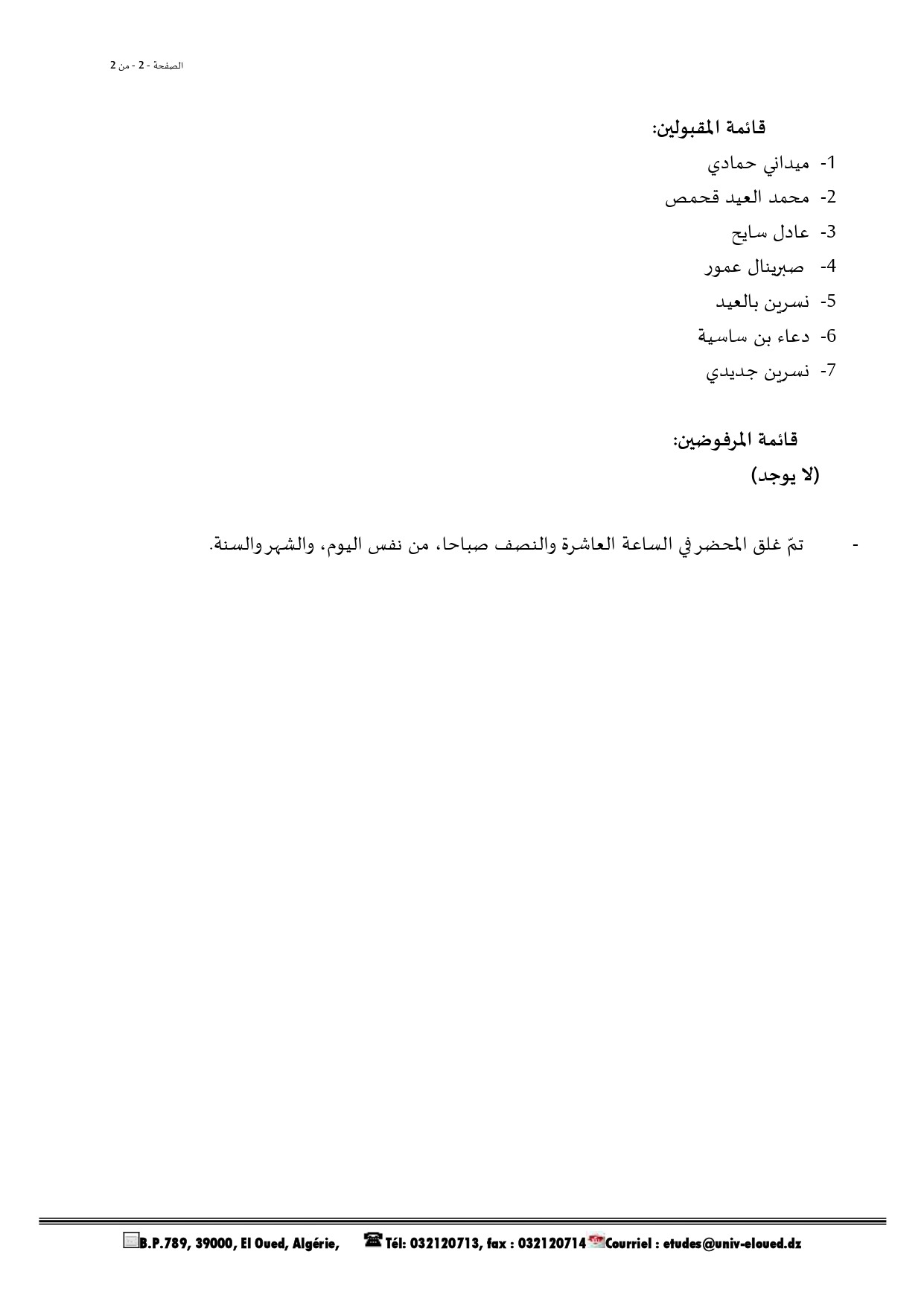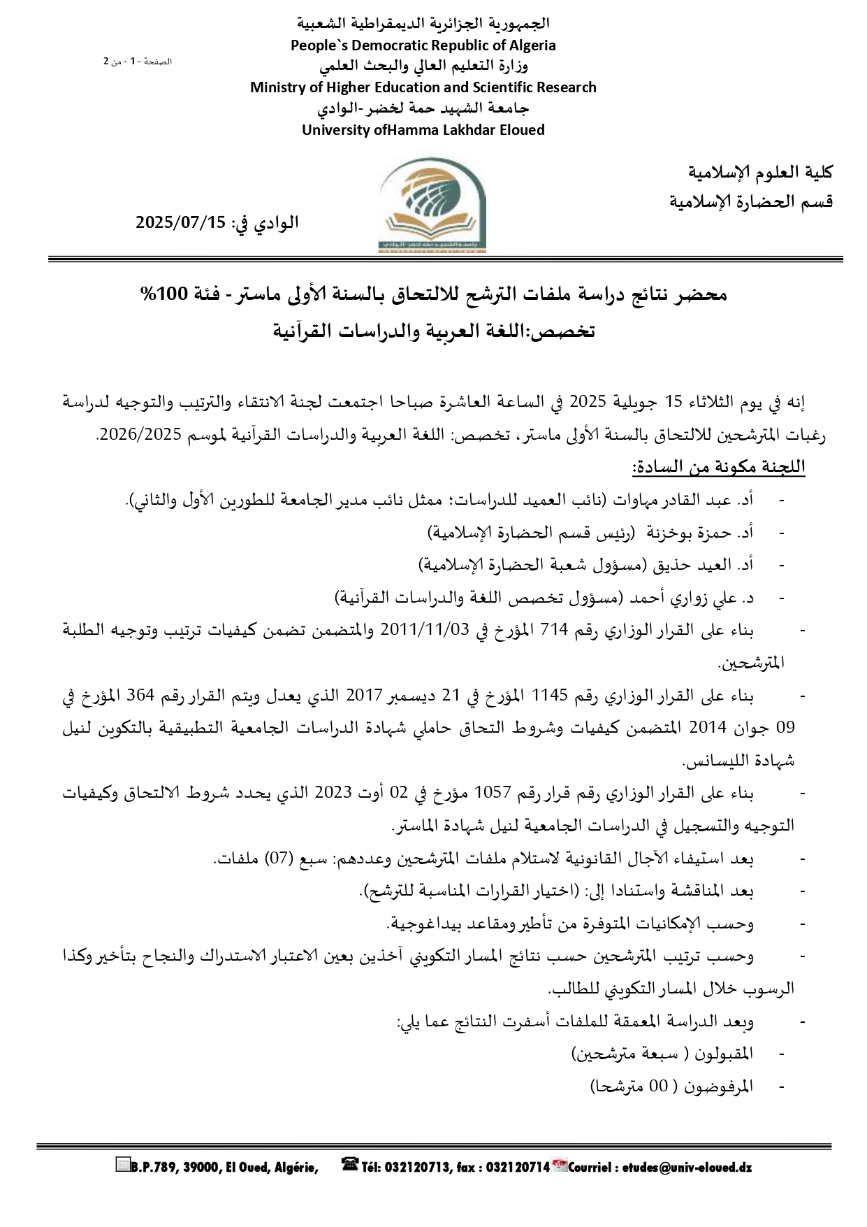 محضر نتائج دراسة ملفات الترشح للسنة الأولى ماستر - فئة 100% - تخصص اللغة والدراسات القرآنية