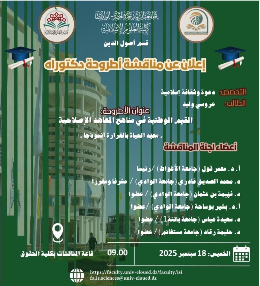 هنيئا للباحث عروسي وليد حصوله على شهادة الدكتوراه في تخصص الدعوة والثقافة الإسلامية من قسم أصول الدين بكليتنا، وبتقدير : مشرف جدا.