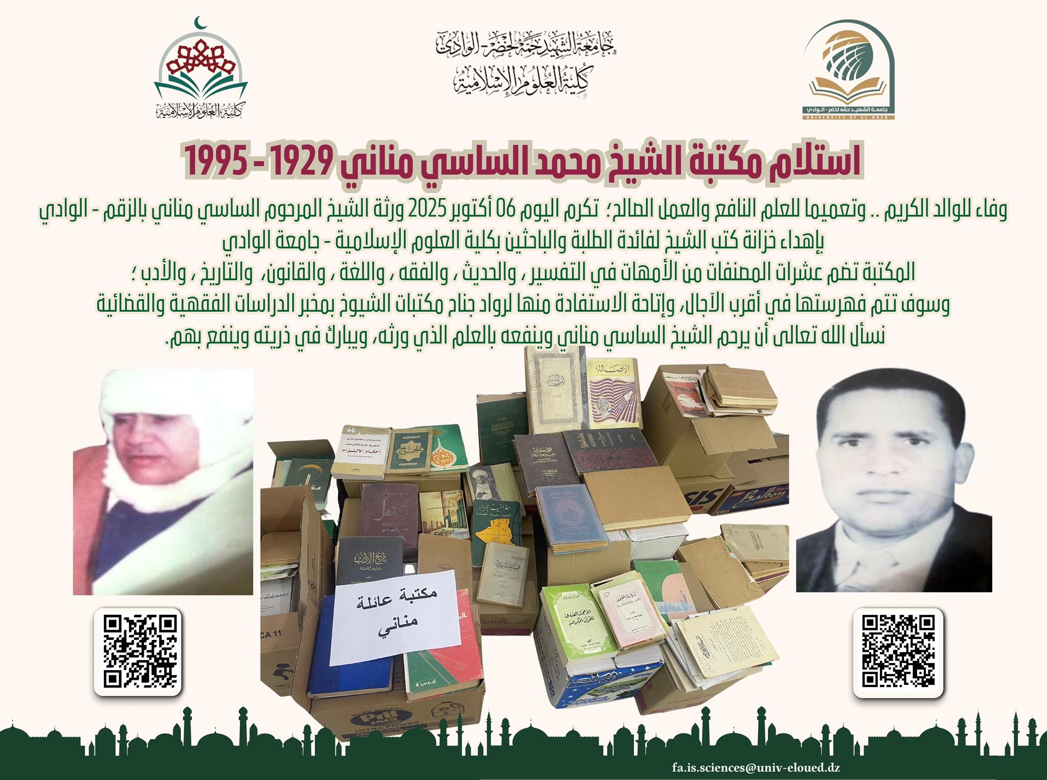 إهداء مكتبة الشيخ الساسي مناني (1929- 1995م) -رحمه الله- إلى كلية العلوم الإسلامية بجامعة الشهيد حمه لخضر - الوادي.