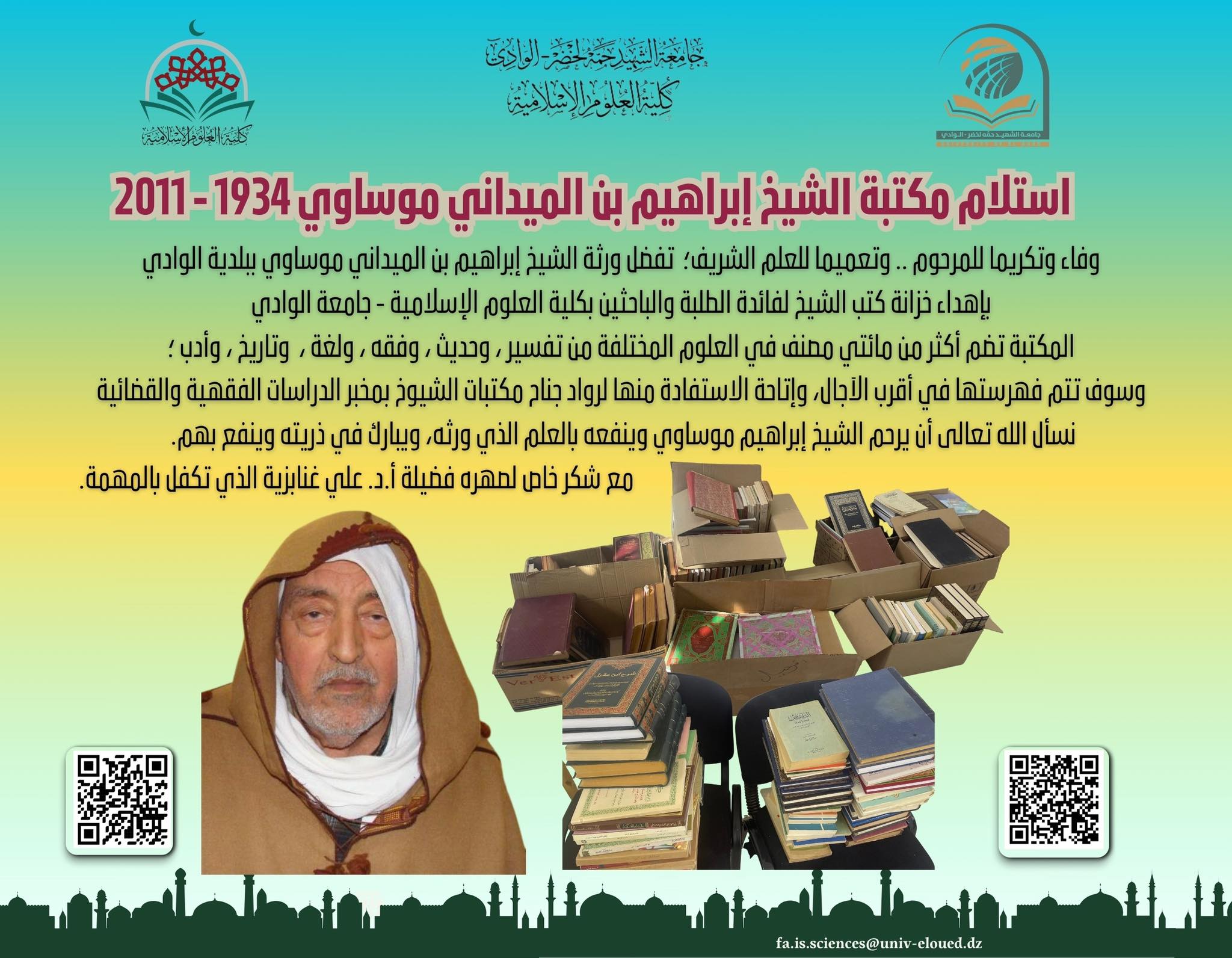 إهداء مكتبة الشيخ إبراهيم بن الميداني بن محمد العربي موساوي (1934 - 2011) - رحمه الله - لفائدة الطلبة والباحثين بكلية العلوم الإسلامية - جامعة الشهيد حمه لخضر - الوادي.