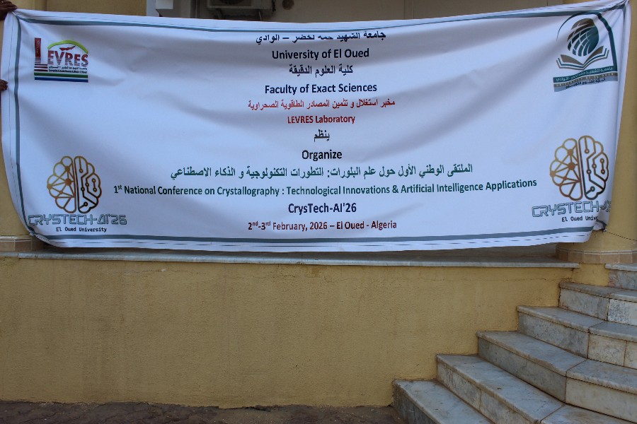 نظم مخبر استغلال وتثمين المصادر الطاقوية الصحراوية (LEVRES) صباح اليوم الاثنين الموافق لـ 02 فيفري 2026، على الساعة 09:00 صباحًا بقاعة المحاضرات الصغرى، الملتقى الوطني الأول لعلم البلورات: الابتكارات التكنولوجية و تطبيقات الذكاء الاصطناعي (CrysTech-A 2026)، الذي ترأسته مديرة الملتقى الأستاذة الدكتورة زروال صورية، وتحت إشراف السيد عميد الكلية الأستاذ الدكتور عبد الوهاب منصور ومدير المخبر الأستاذ الدكتور محبوب محمد الصادق، وبمشاركة نائب العميد لما بعد التدرج، ورئيس قسم الفيزياء، والأمين العام للكلية.