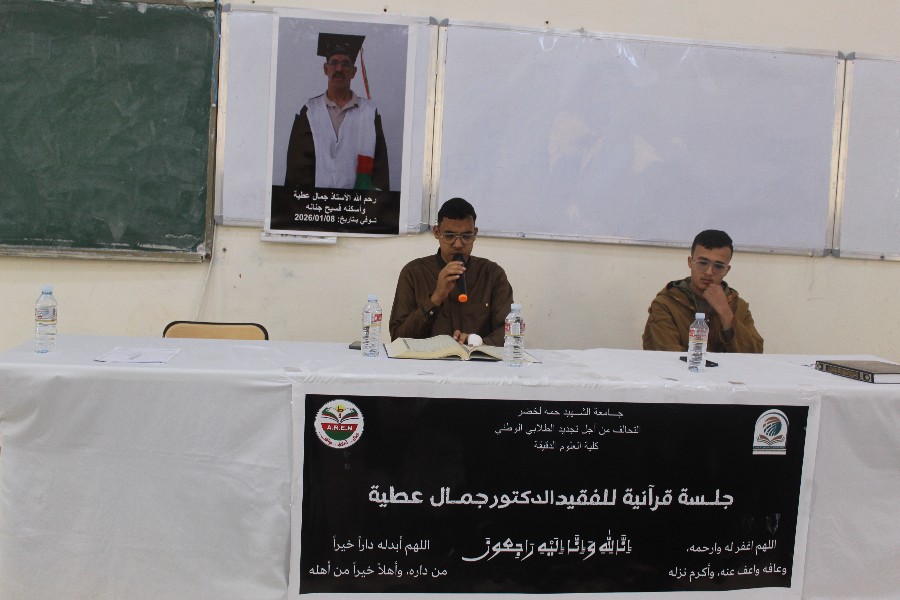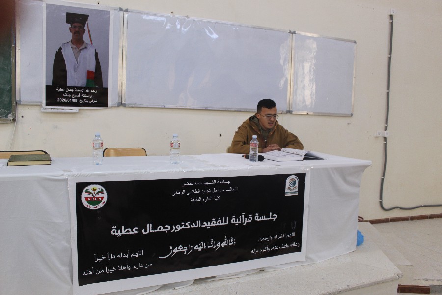 أشرف عميد الكلية البروفيسور عبد الوهاب منصور على إفتتاح تأبينية الإستاذ المرحوم جمال عطية وبحضور نائب العميد لما بعد التدرج البروفيسور / بقاص عز الدين والبروفيسور / التهامي العانز و مدير الدراسات الدكتور / تواتي ابراهيم محمد السعيد والأمين العام للكلية الدكتور / هاني الصادق و رؤساء الاقسام و نوابهم وأساتذة الكيمياء و الفيزياء و أعضاء من منظمة التحالف من أجل التجديد الطلابي الوطني و القارئين / محمد العيد عطيالله تخصص اعلام الي و الطالب / نضال رزوق تخصص بيولوجيا حيث تم البرنامج كالأتي :كلمة افتتاحية ثم الوقوف دقيقة دعاء على روح الفقيد تم كلمة القاها العميد ذكر فيها خصال وشمائل المرحوم بعدها تلاوة مباركة من الطالبين الكريمين حيث طلب الحضور من العميد تسمية النادي العلمي للكيمياء باسم المرحوم جمال عطيه و في الأخير اختتم اللقاء بالدعاء للفقيد.
