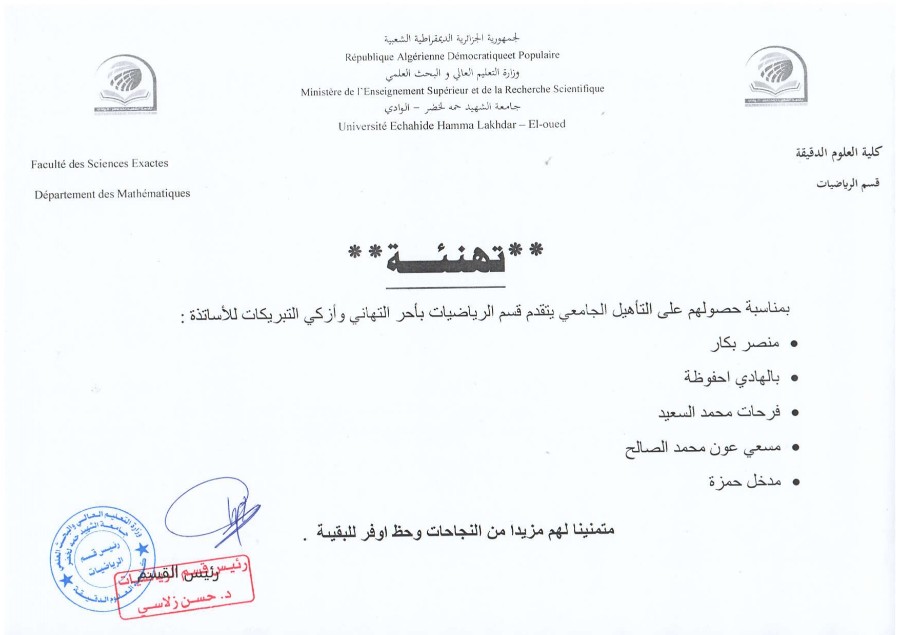 تهنئة التأهيل الجامعي لأساتذة قسم الرياضيات وهم :